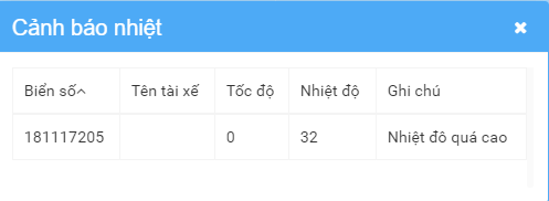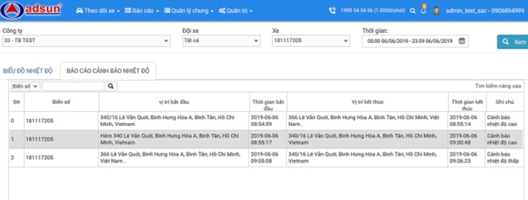 Sau khi đã cài đặt nhiệt độ. Khi nhiệt độ thùng xe vượt mức được cài đặt sẵn, màn hình chính của phần mềm quản lý xe Adsun sẽ xuất hiện cảnh báo. Cảnh báo này xảy ra đồng thời với âm thanh/hình ảnh cảnh báo ngay tại Cabin xe trước mặt tài xế.