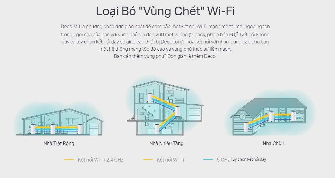 - Một bộ gồm ba thiết bị Deco M4 có thể tạo ra một vùng phủ Wi-Fi lên từ 200 đến 370 mét vuông (phiên bản EU)†. Và nếu như vậy vẫn là chưa đủ, bạn chỉ cần thêm thiết bị Deco vào hệ thống Deco hiện có của bạn để gia tăng vùng phủ.