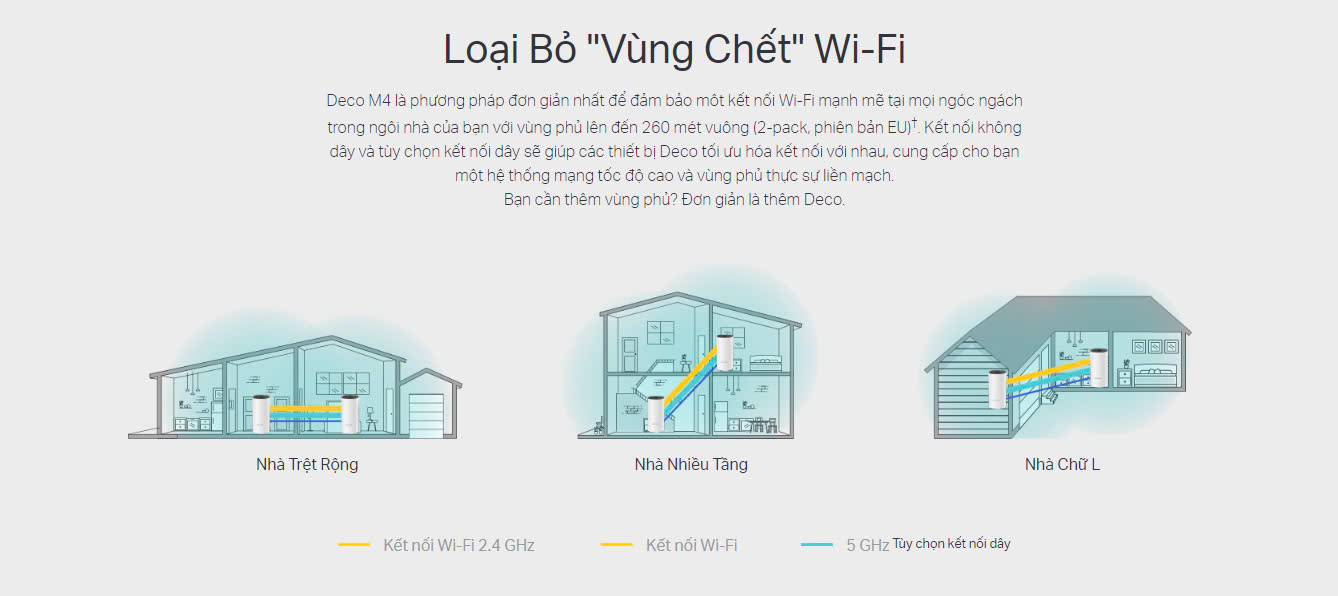 - Một bộ gồm ba thiết bị Deco M4 có thể tạo ra một vùng phủ Wi-Fi lên từ 100 đến 220 mét vuông (phiên bản EU)†. Và nếu như vậy vẫn là chưa đủ, bạn chỉ cần thêm thiết bị Deco vào hệ thống Deco hiện có của bạn để gia tăng vùng phủ.