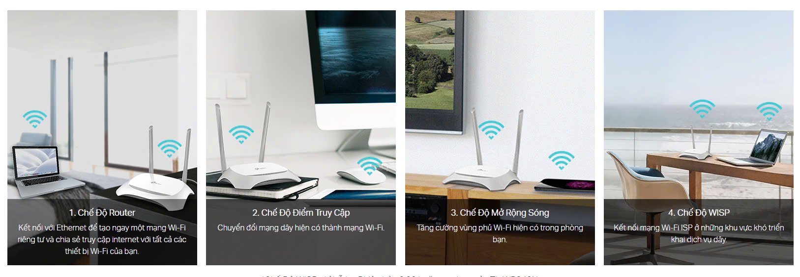 - Hỗ trợ 4 chế độ: Chế độ Router, Mở Rộng Sóng, Điểm Truy Cập và WISP