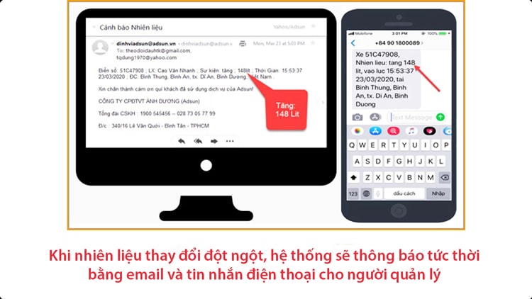 Ngoài ra, các thông tin về mức thay đổi nhiên liệu đột ngột từ việc nạp hoặc xả nhiên liệu xe sẽ được thông báo ngay lập tức qua email hoặc tin nhắn SMS qua điện thoại của người quản lý.