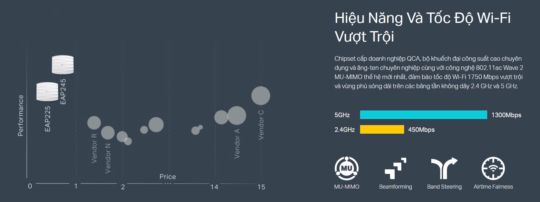 - Công Nghệ Không Dây Tiên Tiến: Tối ưu hóa hiệu suất mạng với các công nghệ MU-MIMO, Band Steering, Airtime Fairness và Beamforming.
